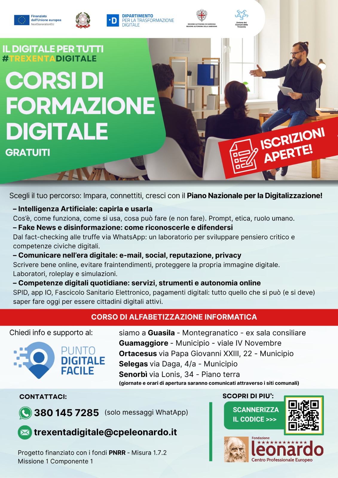 Si rende noto che nell'ambito delle attività del Punto Digitale Facile sono in a breve inizieranno dei corsi gratuiti di alfabetizzazione digitale (informatica di base) e degli incontri di approfondimento su argomenti digitali di attualità come indicato in locandina, dedicati a tutti i residenti nei comuni di Guamaggiore, Guasila, Ortacesus, Selegas e Senorbì.